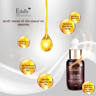 Huyết thanh tổ yến Edally EX Hàn Quốc là sản phẩm chăm sóc da giúp cải tạo độ đàn hồi, cho da trẻ trung, khỏe mạnh và mịn màng, cho làn da nhuận sắc, sáng mịn, hồng hào đầy sức sống.