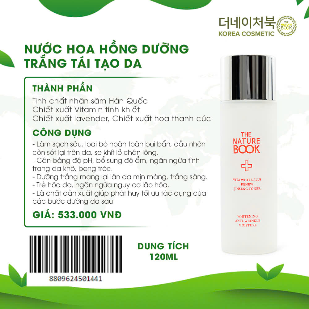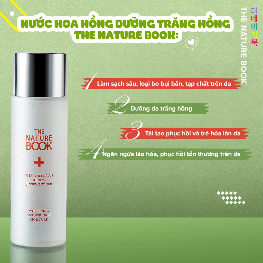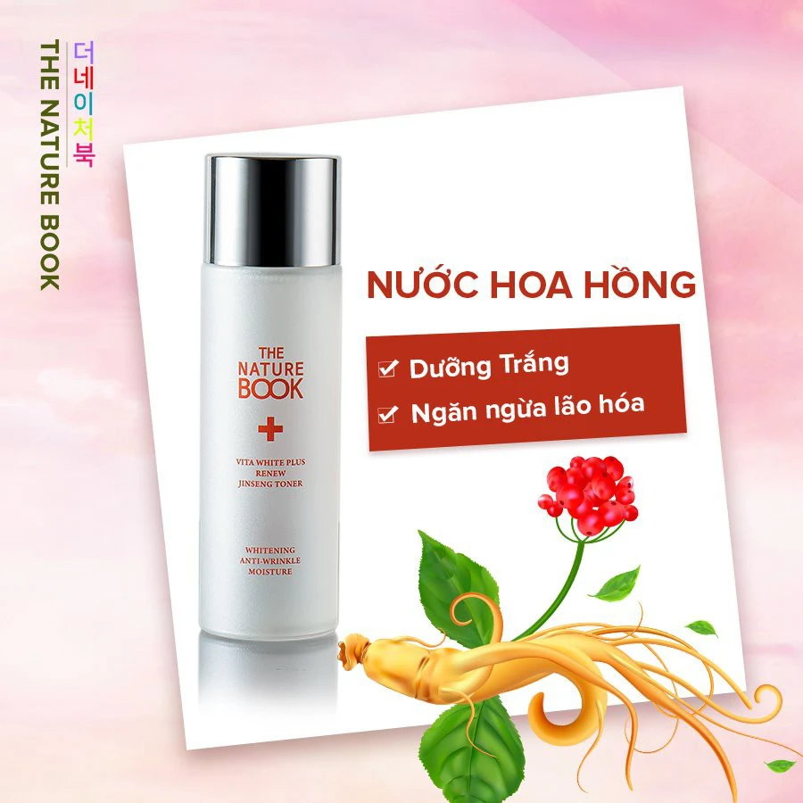 Nước hoa hồng dưỡng trắng hồng và tái tạo da The Nature Book chứa hơn 93.000 ppm hàm lượng Vitamin và chiết xuất nhân sâm đỏ Hàn Quốc, giúp dưỡng trắng, cung cấp độ ẩm và ngăn ngừa lão hóa, giữ cho làn da luôn tươi trẻ